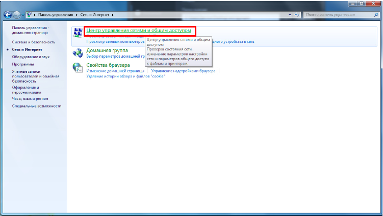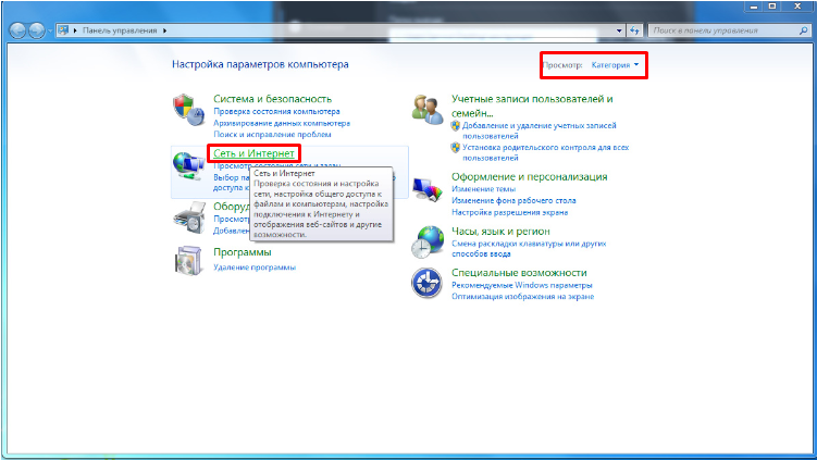 «Сеть и Интернет», справа наверху просмотр разделов должен