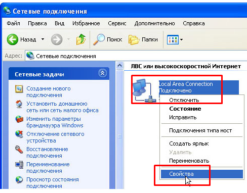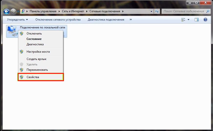 «Подключение по локальной сети», нажимаем правой кнопки мыши и выбираем